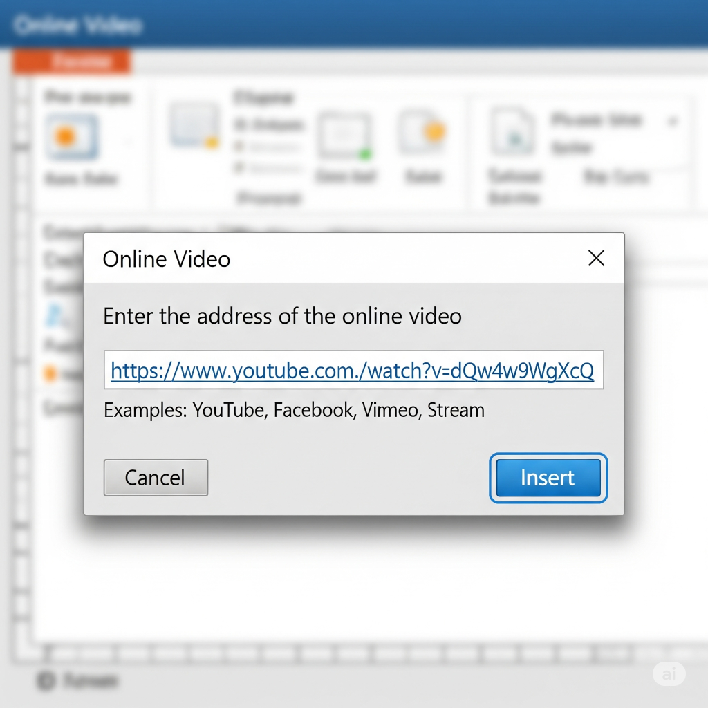 Paste and Insert: A dialog box will appear. In the designated field (typically “Enter the URL of the online video”), paste the previously copied YouTube video link. Press the Insert button.